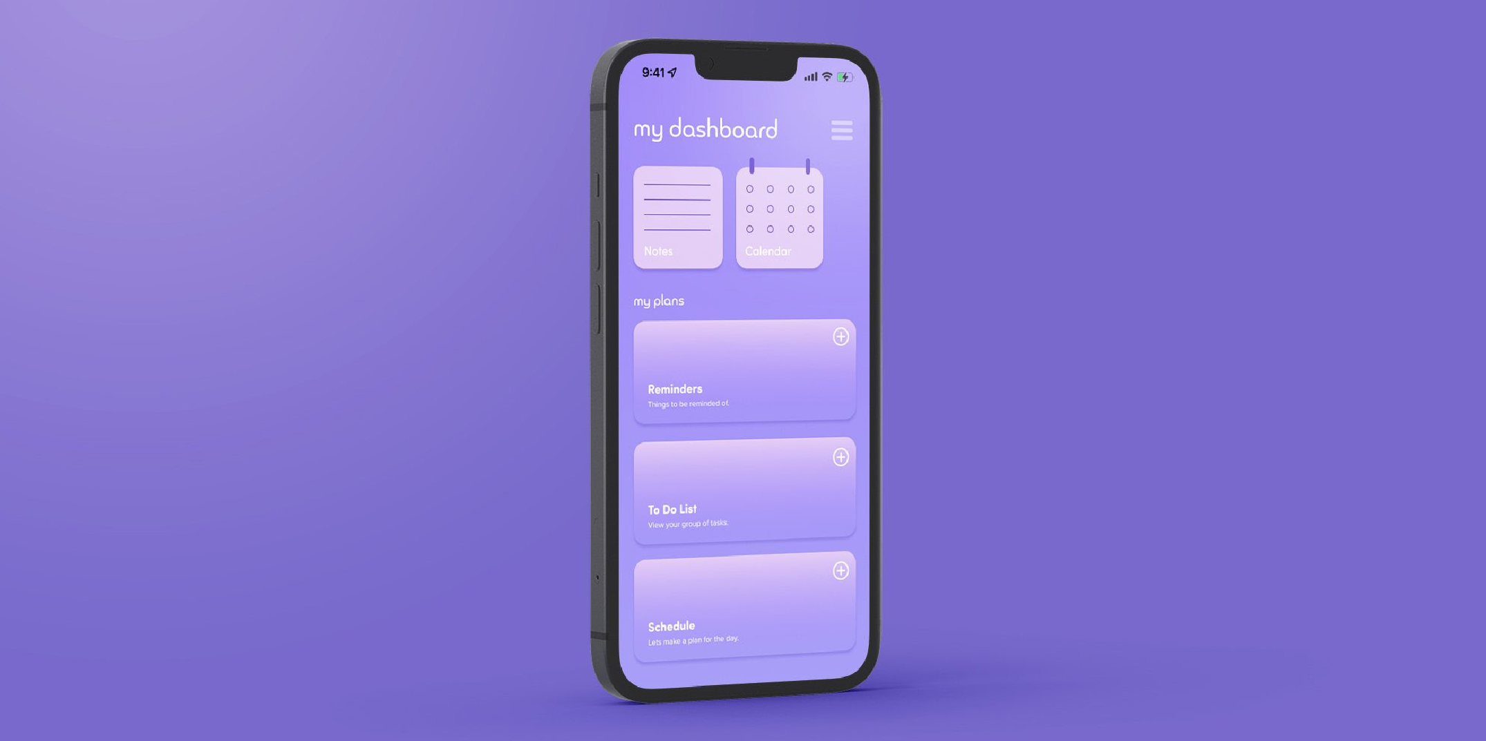 People often feel frustrated and overwhelmed by the lack of organization in their daily lives, leading to stress and anxiety. The challenge was to create a planning app that not only simplifies scheduling and task management but also promotes calm and focus, using thoughtful design choices, like a soothing purple palette, to help users feel centered while staying organized.